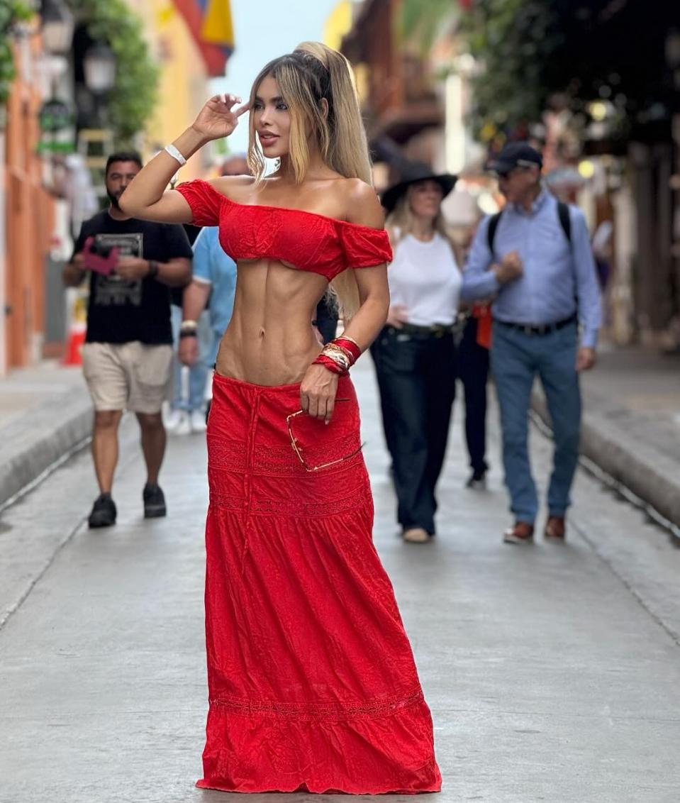 Колумбийская инфлюенсер Татьяна Мурильо позирует на улице в ярком красном платье после многочисленных косметических процедур