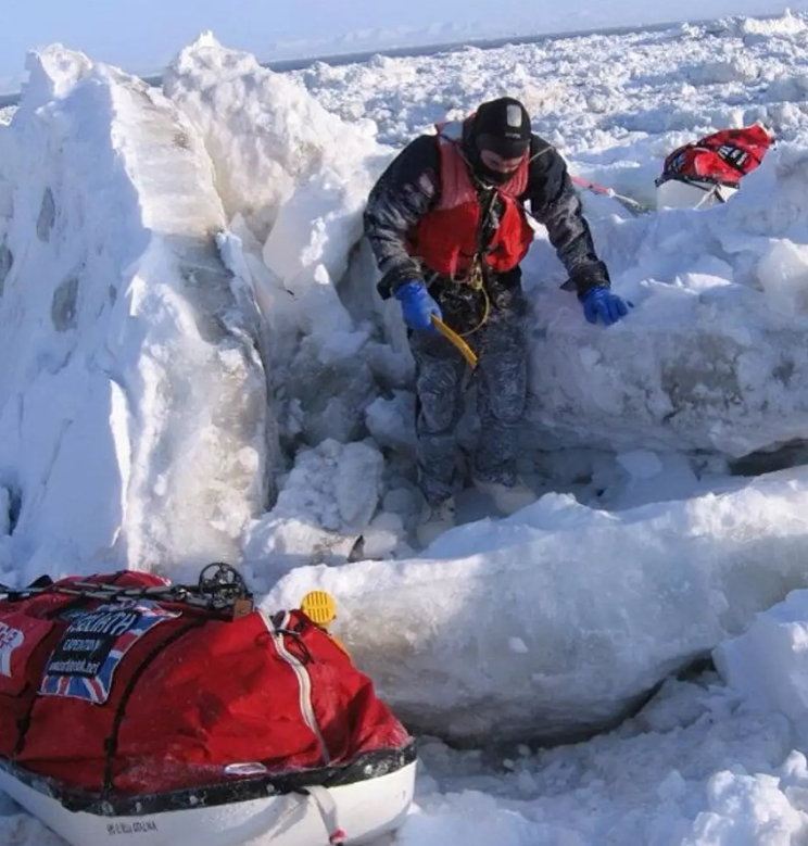 Карл Бушби пробирается через массивные льды в арктических условиях, ведя сани с оборудованием во время своего пешего путешествия