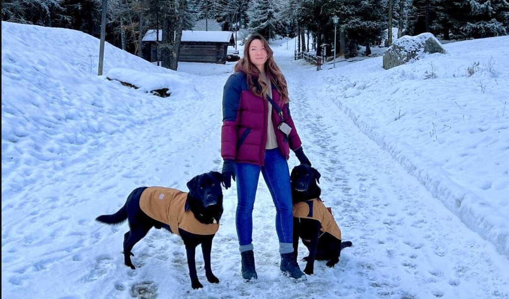 Женщина с двумя собаками в зимнем лесу во время путешествия по Европе