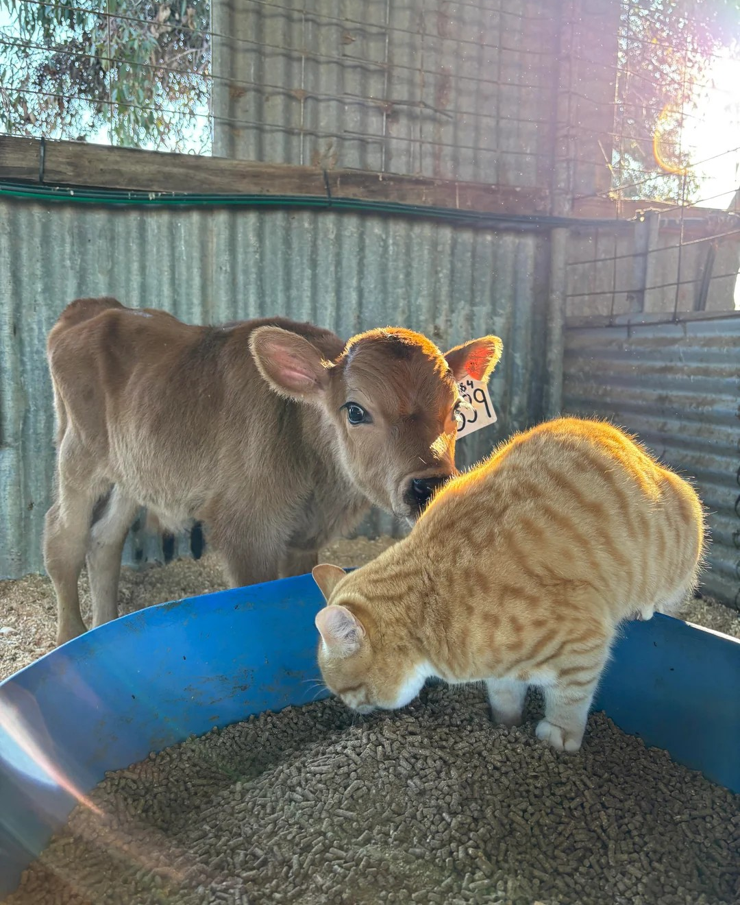 На еще одной фотографии котик лежит рядом с теленком, которому проводит "сеанс эмоциональной поддержки". А третий кадр показывает настоящий "кошачий аудит" — пушистый проверяет качество корма для коровки с номером "539".