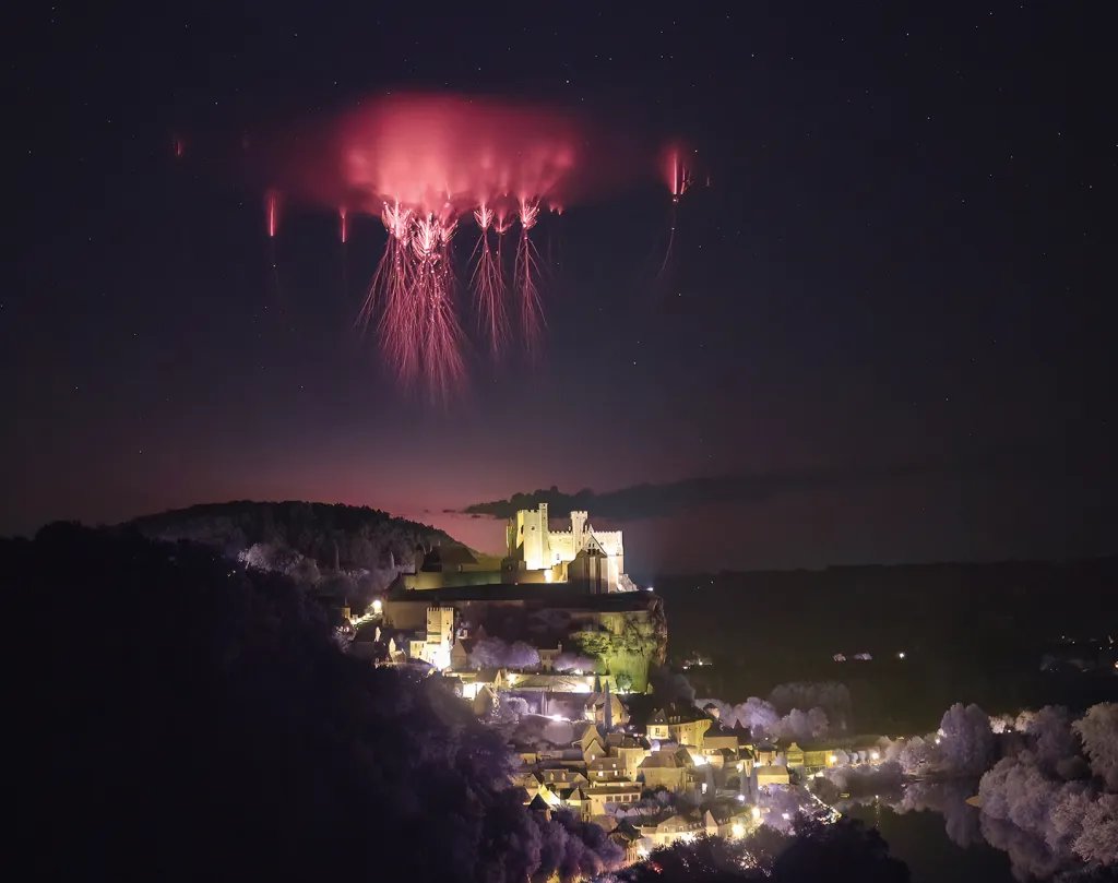 Ученые говорят, что речь идет о редком атмосферном явлении — red sprite, или "красные спрайты". Эти эффектные электрические разряды возникают высоко над мощными грозами и внешне напоминают медуз с сияющим куполом и длинными светящимися "щупальцами".