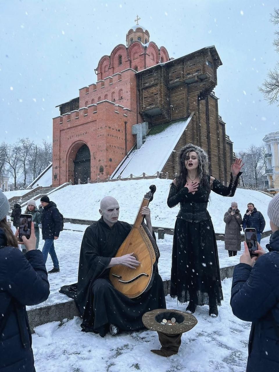 С помощью искусственного интеллекта мужчина перенес героев "Поттерианы" в Украину. На его фотографиях Белатриса Лестранж поет у Золотых Ворот под аккомпанемент лорда Волдеморта на бандуре, а Северус Снейп, Сириус Блэк и Ремус Люпин пьют пиво на Андреевском спуске.