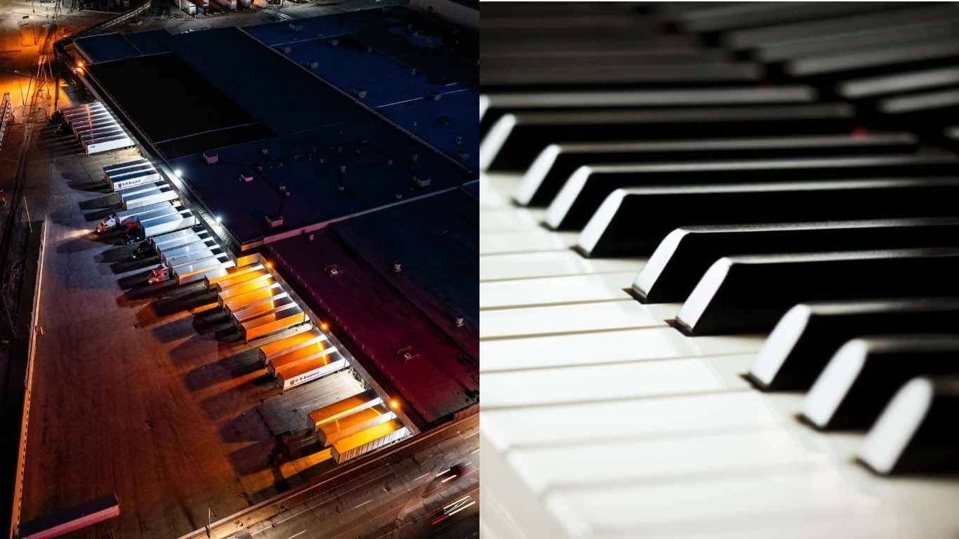 Однако если внимательно взглянуть, то на земле лежит гигантский музыкальный инструмент с четко очерченными черными и белыми клавишами. Вероятно, речь идет о поле или участке земли с параллельными полосами почвы и элементами инфраструктуры, которые вместе напомнили клавиатуру пианино.