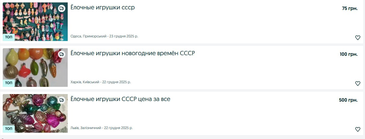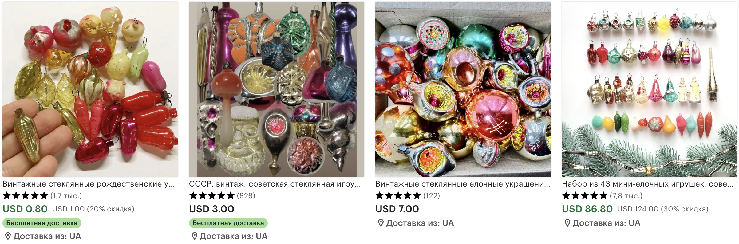 Спрос на советские елочные украшения существует не только в Украине. На зарубежных маркетплейсах, в частности Etsy и eBay, также активно продают винтажные новогодние игрушки из СССР, позиционируя их как коллекционные и ностальгические предметы.