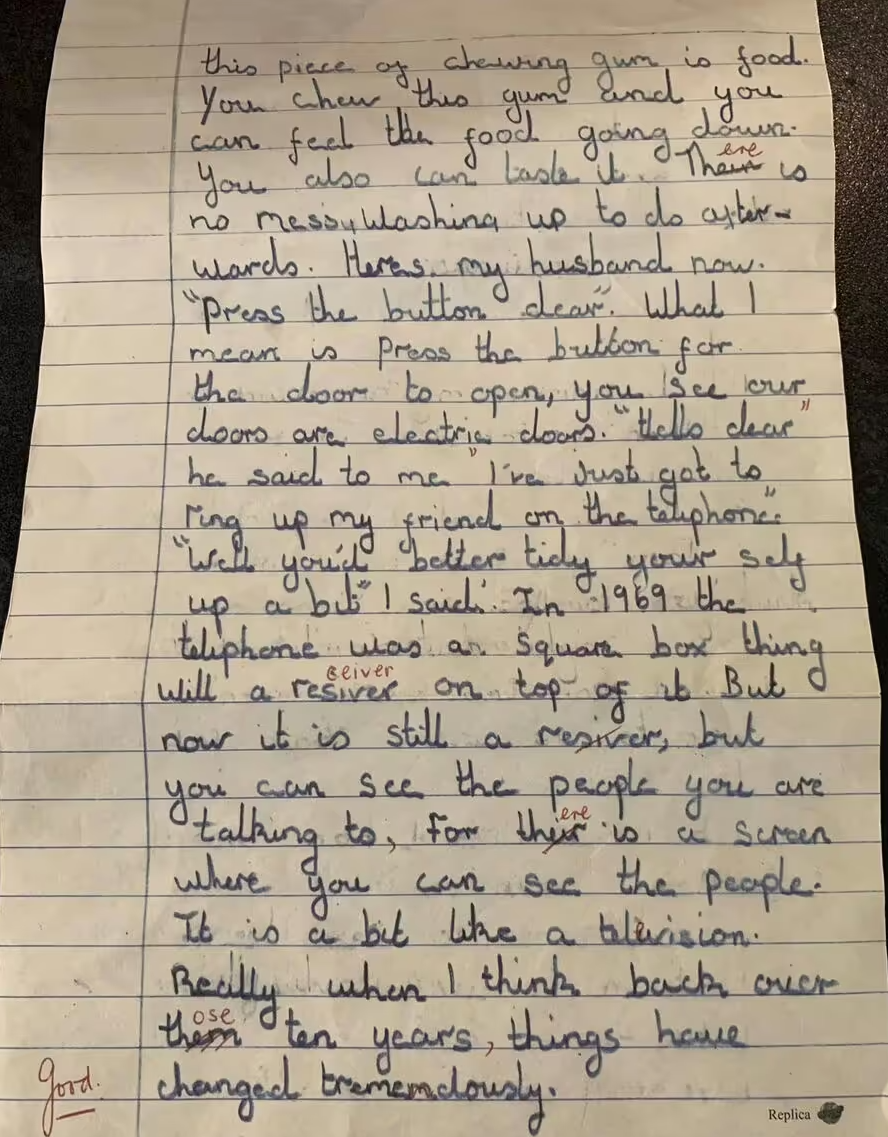 "Здравствуй, дорогая, — сказал он мне. Я только что позвонил своему другу по телефону. В 1969 году телефон представлял собой квадратную коробку с ресивером на крышке. Сейчас это все еще ресивер, но вы можете видеть людей, с которыми разговариваете, потому что есть экран, на котором вы можете видеть людей. Это немного похоже на телевизор", — написала школьница.