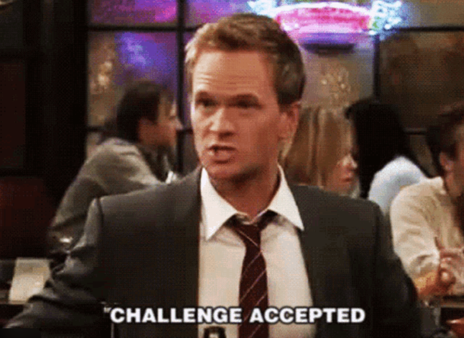 Барни Стинсон с самоуверенной улыбкой произносит фразу "Challenge accepted", соглашаясь на любую, даже абсурдную идею.