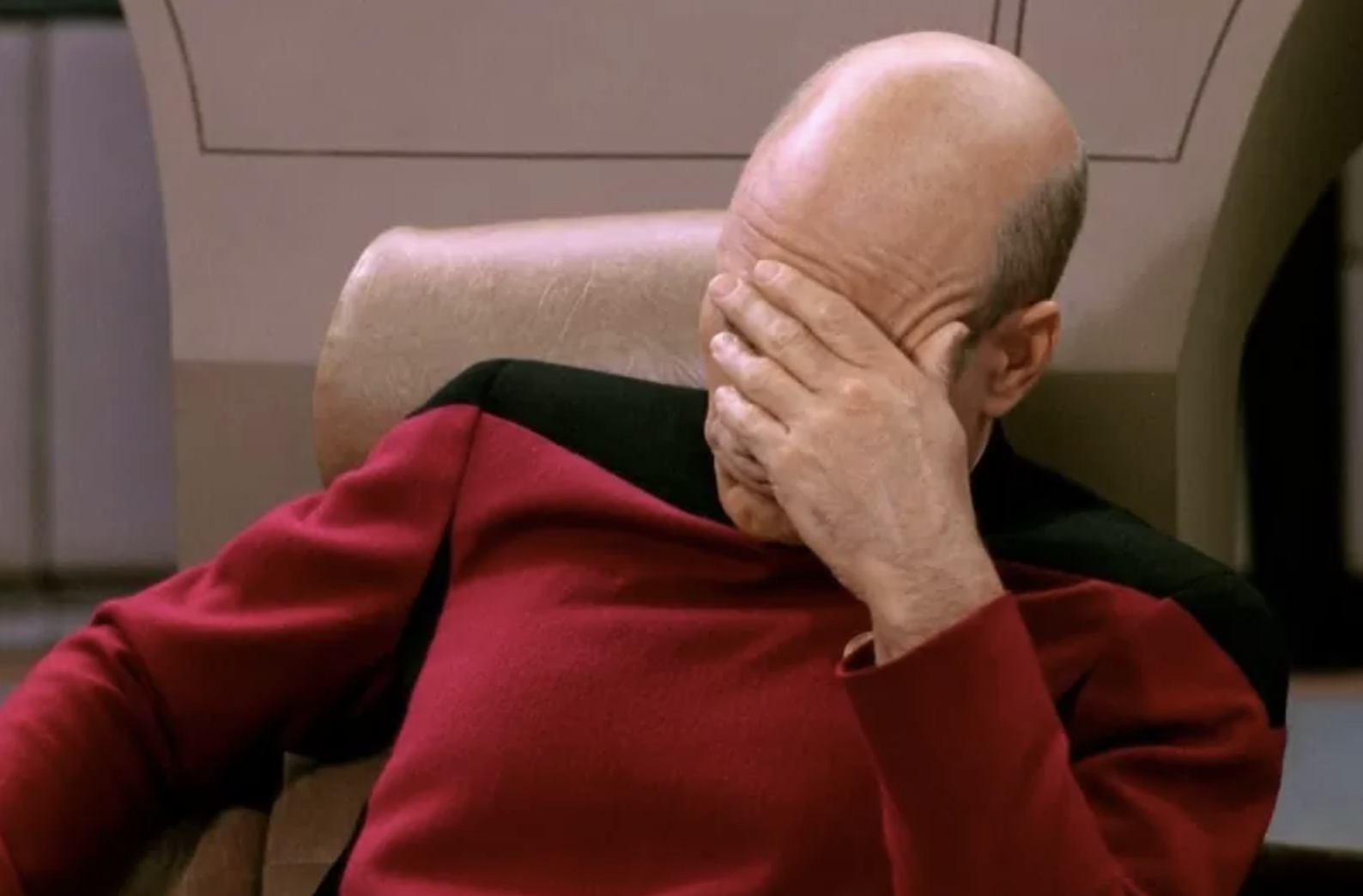 Капитан Жан-Люк Пикар закрывает лицо рукой, выражая глубокое разочарование происходящим. Сцена появляется в моменты, когда ситуация становится абсурдной, нелогичной или откровенно безнадежной.