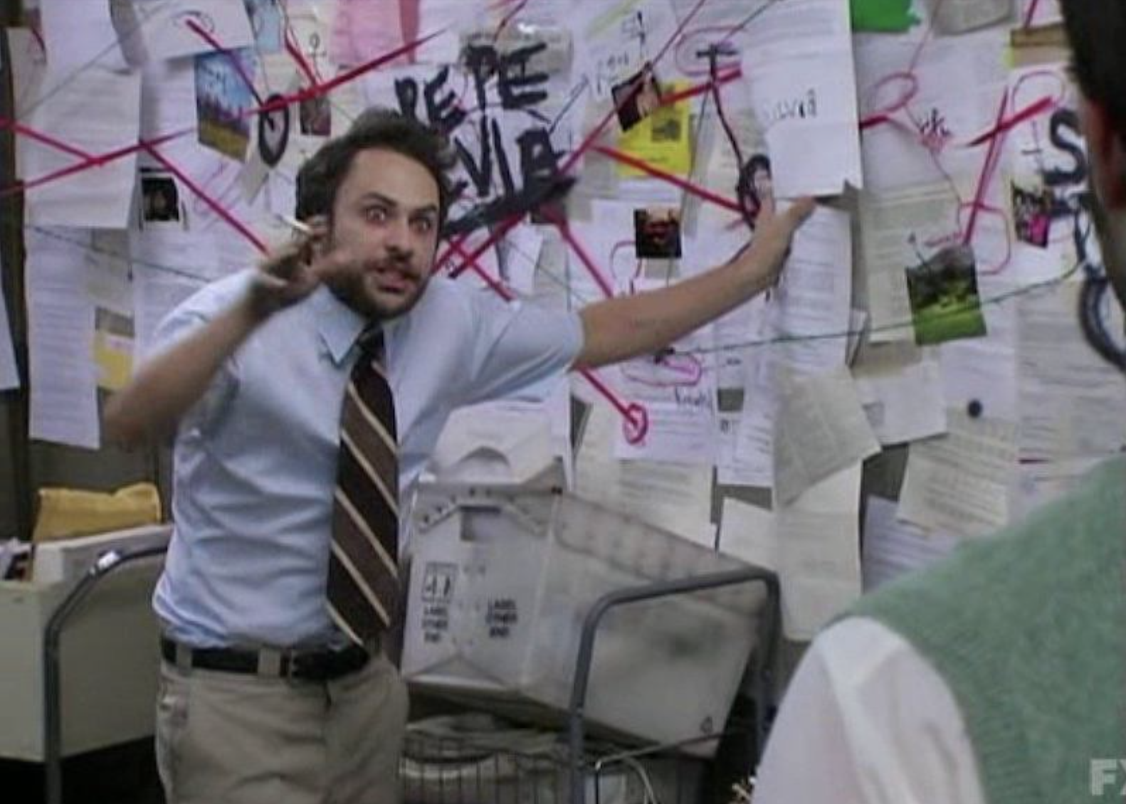 Персонаж по имени Чарли Келли убежден, что раскрыл масштабный заговор. Он связывает документы, фотографии и заметки на доске, пытаясь доказать существование человека по имени Пепе Сильвия, которого, как выясняется, не существует.