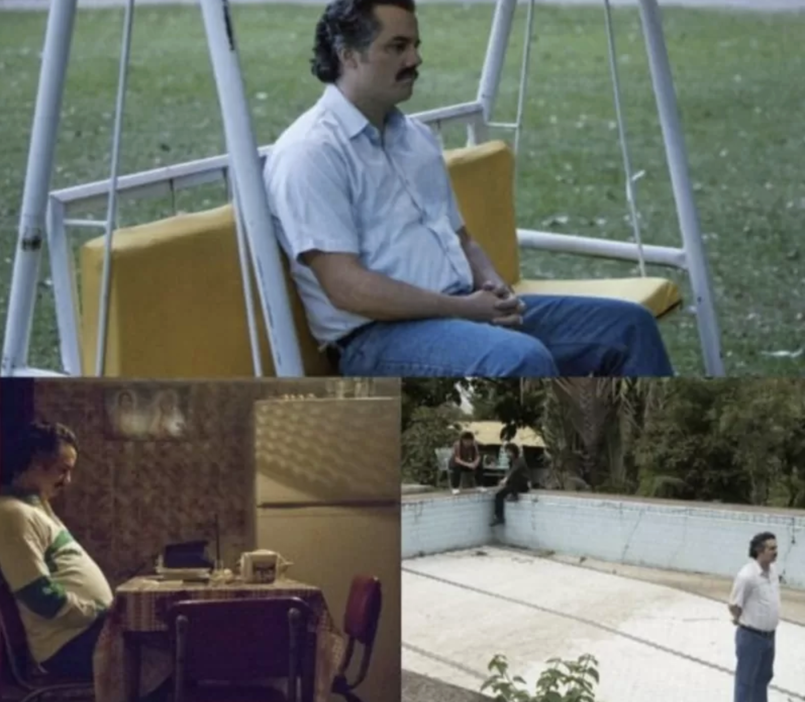 Пабло Эскобар показан в разные моменты одиночества. Сначала он сидит на качелях, за столом, потом стоит у пустого бассейна или просто ждет, глядя в никуда. В сериале эти сцены подчеркивают изоляцию персонажа и медленное разрушение его мира.