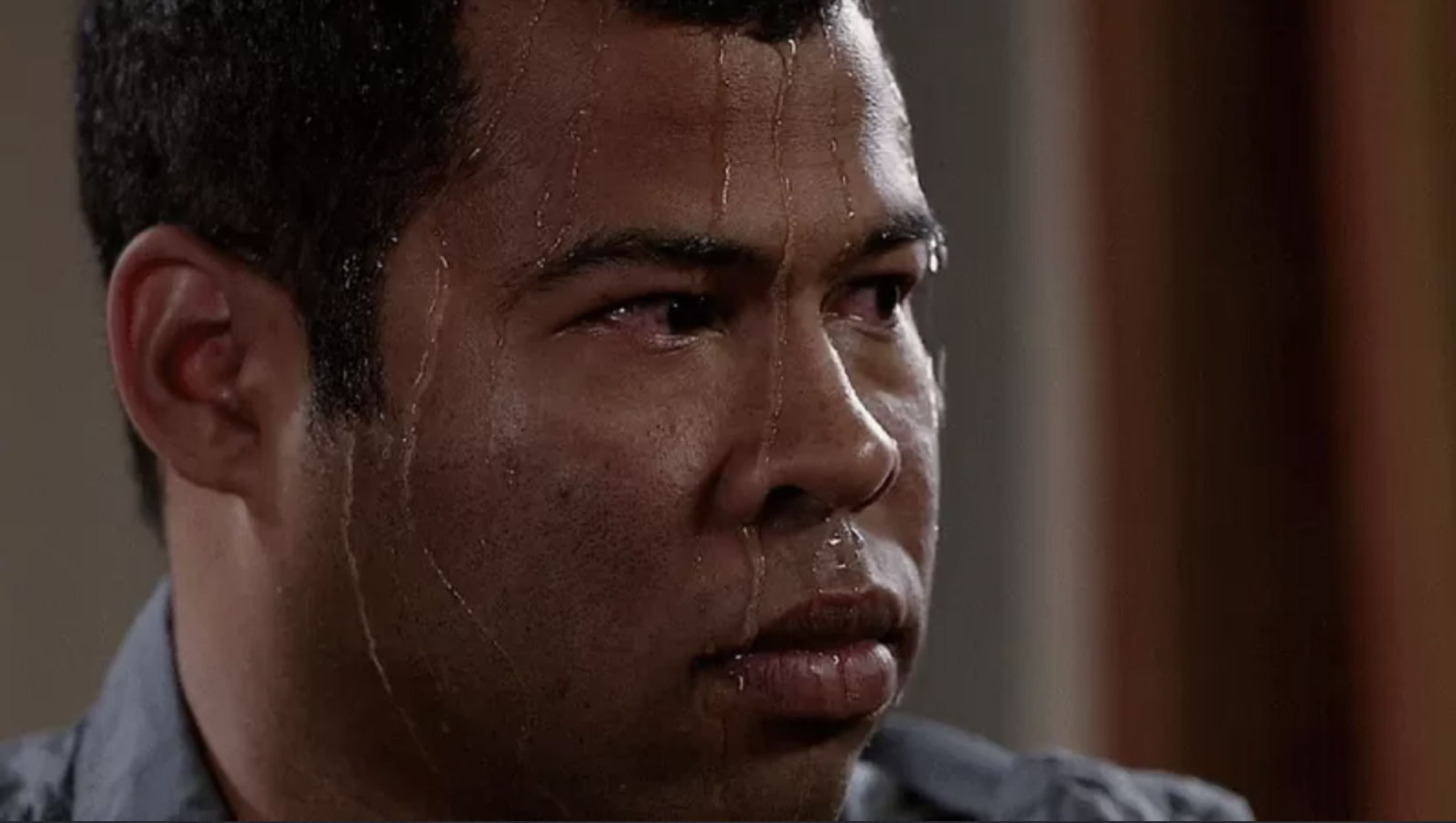 Персонаж в исполнении Джордана Пила напряженно слушает собеседника. По его лицу стекают капли пота. Ситуация становится все более неловкой, а ставки растут. Он старается сохранять спокойствие, но эмоции его выдают.