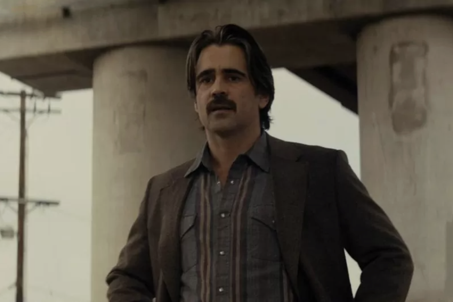 Персонаж Колина Фаррелла (детектив Рэй Велкоро) стоит с тяжелым, выгоревшим выражением лица. В сериале этот момент отражает состояние человека, который слишком многое понял о мире, системе и себе самом.