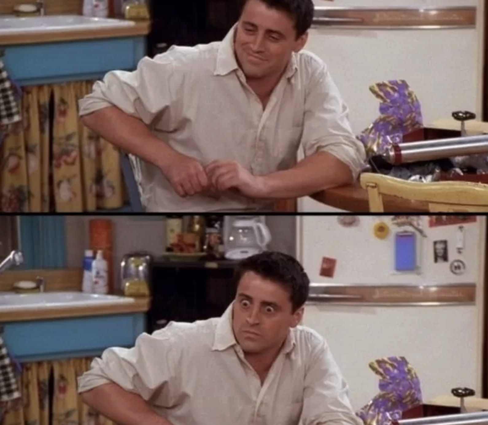 Джоуи Триббиани сначала выглядит расслабленным и довольным, но уже в следующем кадре его лицо резко меняется, глаза расширяются, выражение становится напряженным и встревоженным. Сцена построена на мгновенной смене эмоций без слов.