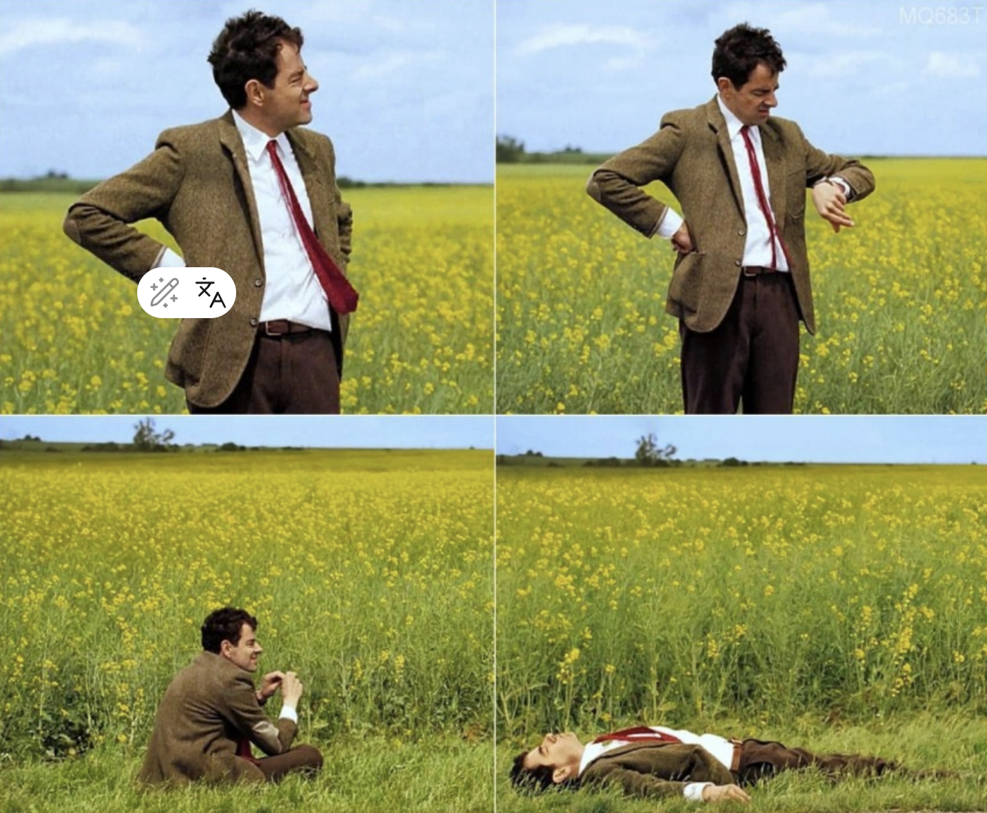 Мистер Бин стоит посреди поля, почесывая голову и растерянно оглядываясь вокруг. Персонаж явно не понимает, как он здесь оказался и что вообще должен делать дальше.