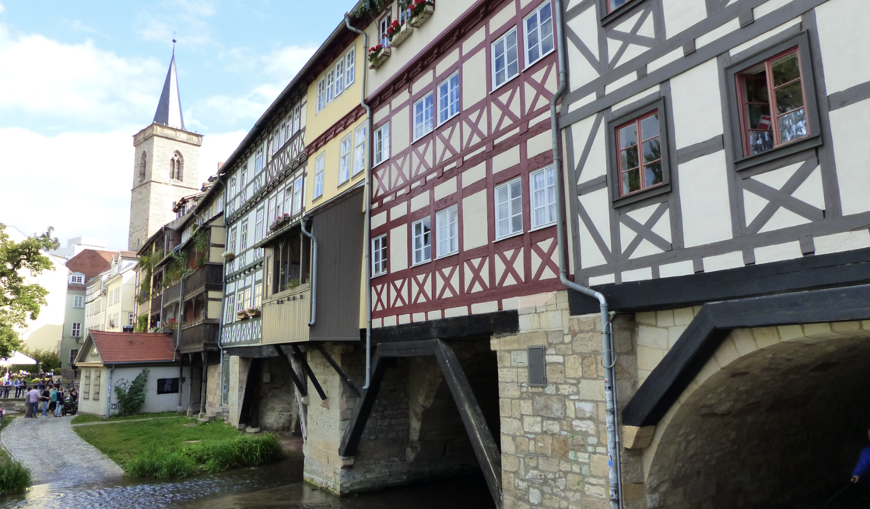 "Крамербрюкке" пересекает реку Гера и в Средние века был важнейшей торговой артерией города. Именно на этом мосту купцы продавали дорогие ткани, специи и ювелирные изделия, благодаря чему его назвали "Купеческим".