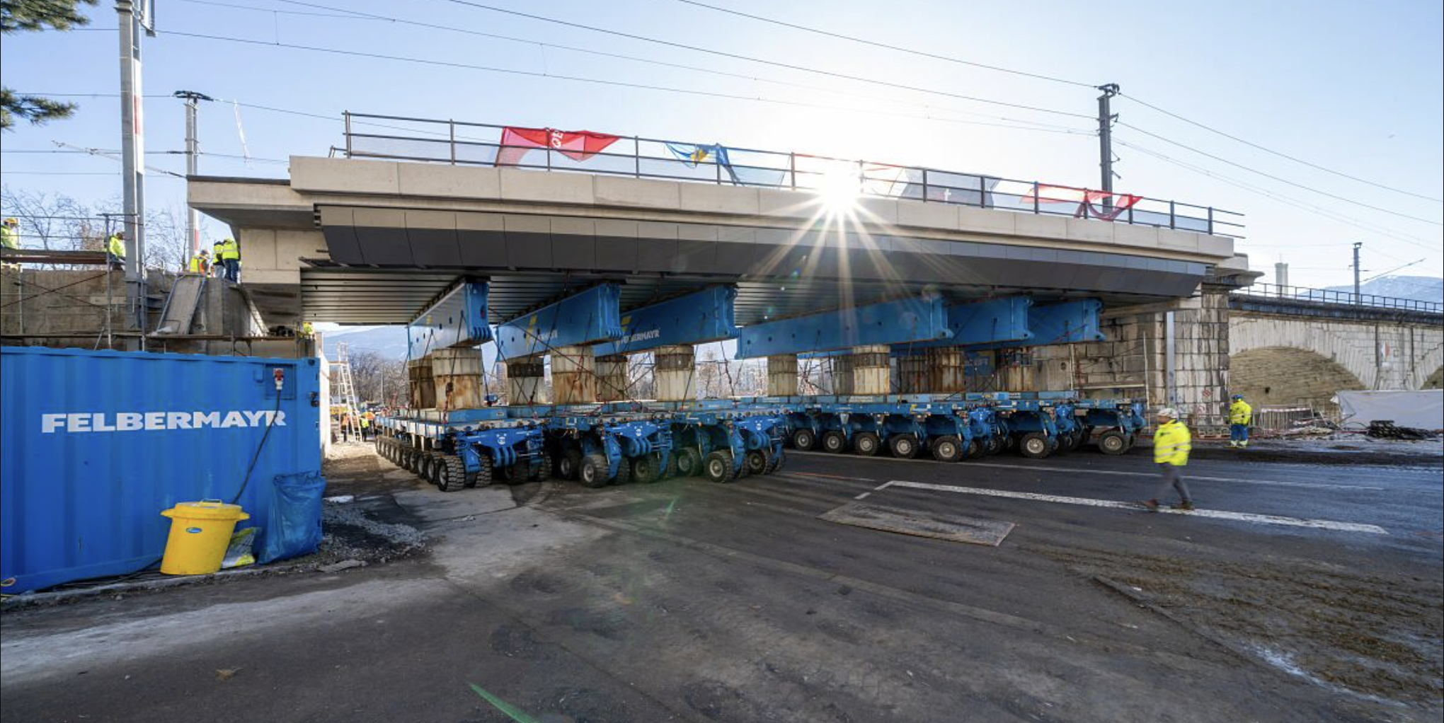 Инженеры перевозят новый железнодорожный мост Раухмюле на многоосных платформах в Австрии