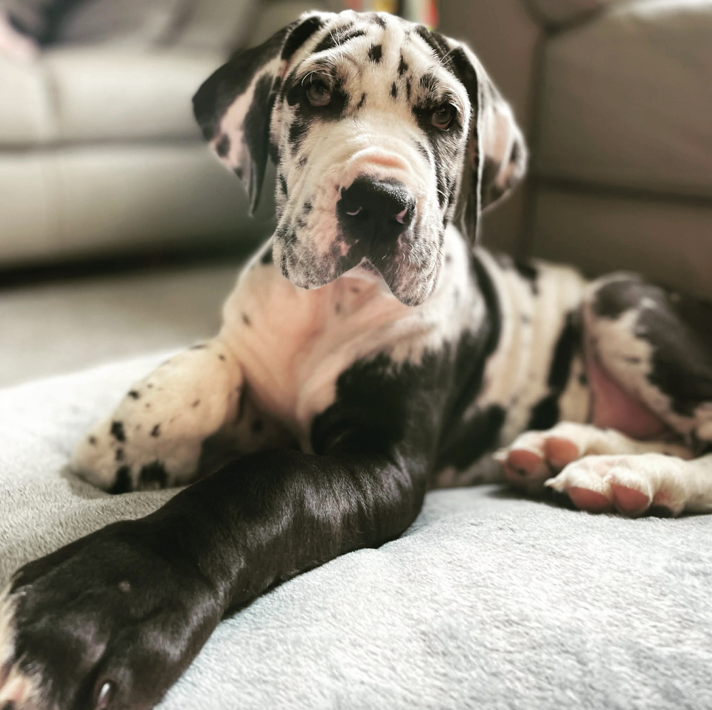 Трехлетний немецкий дог по кличке Элвис весит около 70 килограммов и при этом уверен, что он все еще "комнатный пес". Огромный пес спит на трехместном диване и съедает около двух килограммов корма в день.