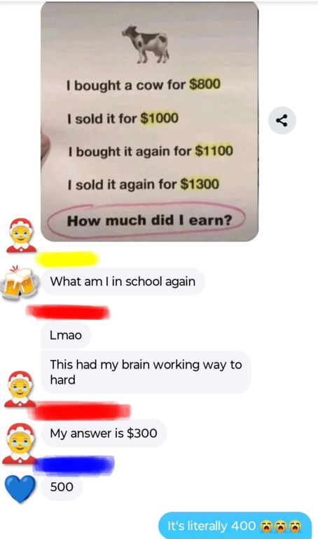 "Моя свекровь прислала эту задачу в наш семейный чат несколько дней назад, и мы до сих пор не можем убедить ее, что правильный ответ — 400 долларов. Мы с мужем уже пытались объяснить это с помощью денег из "Монополии", калькулятора, фейковых банковских приложений и даже просто гуглили ответ. Я уже не знаю, как еще это объяснить. Разве что мы сами чего-то не понимаем", — говорит женщина.