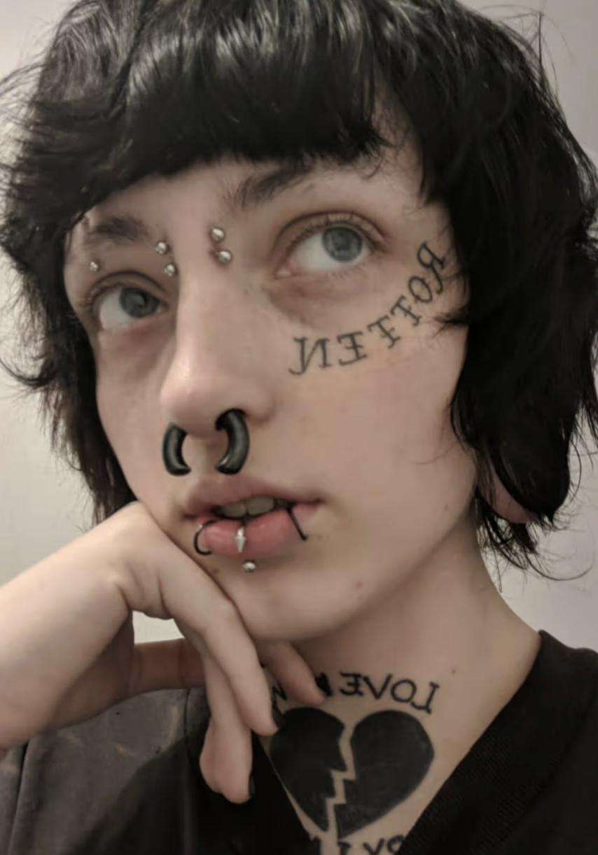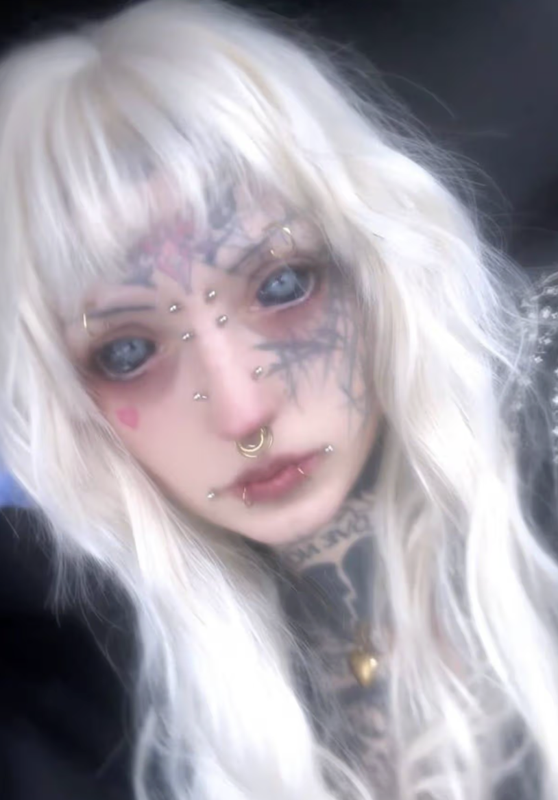 Девушка с пирсингом и татуировками на лице до процедуры татуировки глазных яблок