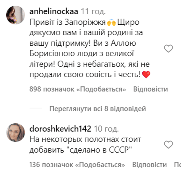 Подписчики оставили в основном одобрительные комментарии под сообщением Галкина. Украинцы благодарят его и его жену, Аллу Пугачеву, за поддержку, а вот россияне оставляют гневные комментарии. Нашлись те, кто пытается приписать достижения украинских художников России, заявляя, что их творческий путь начался еще во времена СССР.