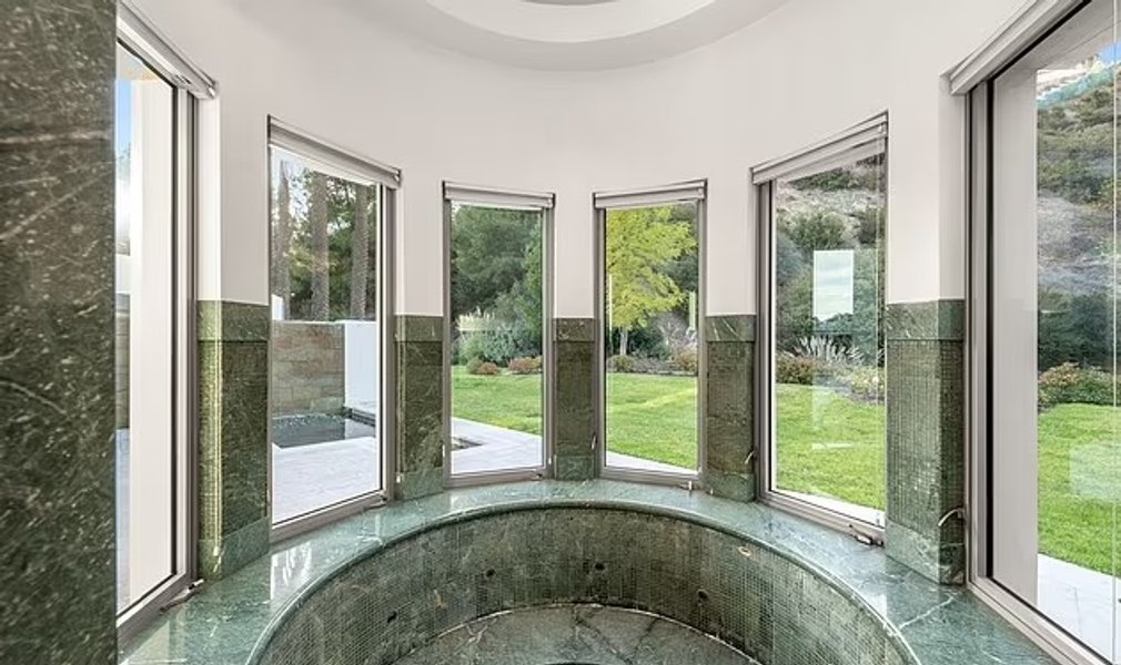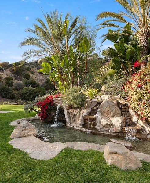 Мегаособняк расположен на участке площадью около семи акров и включает в себя бассейн в курортном стиле с водопадом, второй бассейн для плавания, домик у бассейна и павильон для развлечений. Также каскадные водопады щедро украшают отдельные бассейны на просторном заднем дворе.