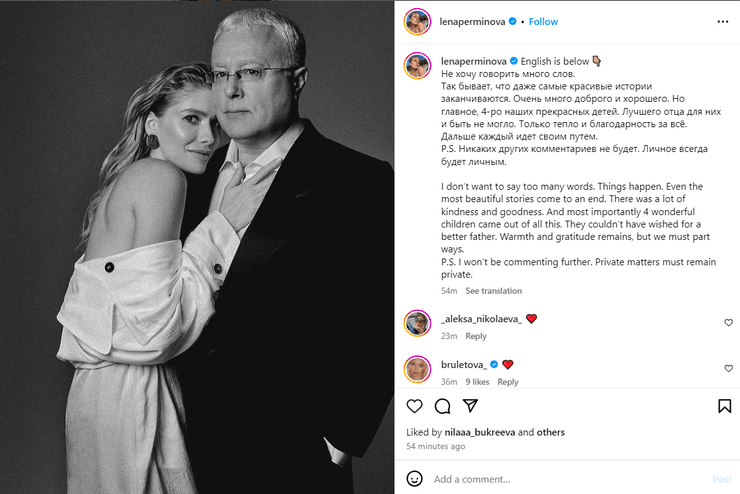 "Не хочу говорить много слов. Так бывает, что даже самые красивые истории заканчиваются. Очень много доброго и хорошего. Но главное, четверо наших прекрасных детей. Лучшего отца для них и быть не могло. Только тепло и благодарность за все. Дальше каждый идет своим путем. P.S. Никаких других комментариев не будет. Личное всегда будет личным".