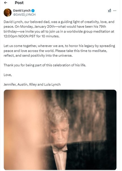 "Дэвид Линч, наш любимый папа, был путеводной звездой творчества, любви и мира. В понедельник, 20 января – в день его 79-летия – мы приглашаем вас всех присоединиться к нам во всемирной групповой медитации в 12:00 по тихоокеанскому времени на 10 минут. Давайте соберемся вместе, где бы мы ни были, чтобы почтить его наследие, распространяя мир и любовь по всему миру. Пожалуйста, уделите это время медитации, размышлению и отправке позитива во вселенную. Спасибо, что стали частью этого празднования его жизни", – говорится в сообщении.