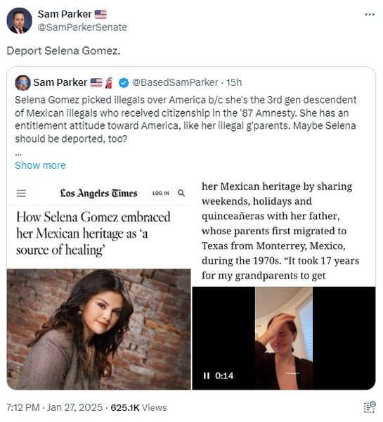 "Селена Гомес выбрала нелегалов вместо Америки, потому что она потомок мексиканских нелегалов в третьем поколении, получивших гражданство по амнистии 87 года. У нее отношение к Америке как к чему-то, что ей должны, как и у ее нелегальных родителей. Может, Селену тоже стоит депортировать?" – написал он.