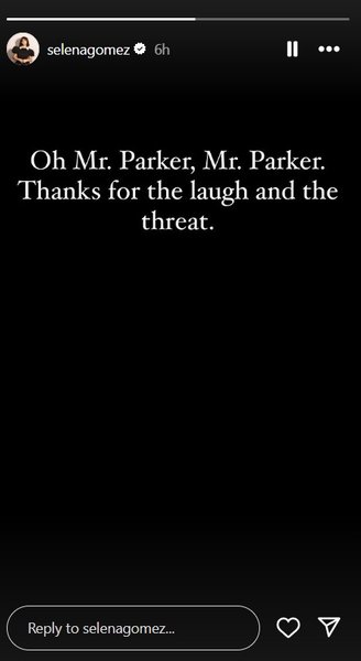 В ответ Гомес, на страницу которой подписаны 422 млн человек, в сторис ответила: "О, мистер Паркер, мистер Паркер. Спасибо за смех и угрозу".