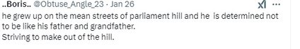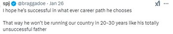 "Он вырос на суровых улицах парламентского холма и полон решимости не быть похожим на своего отца и деда. Стремится преуспеть на холме", "Бедный уличный ребенок из ниоткуда, начинал с нуля. Поет о невзгодах жизни в da-hood", "Хотя, кажется, время для этого не самое подходящее. Хотя, возможно, это даст ему очки жертвы, выскочив в центр внимания в момент самой большой неудачи его отца", "Я надеюсь, что он добьется успеха в любой выбранной им карьере. Тогда он не будет управлять нашей страной через 20-30 лет, как его совершенно неудачливый отец", "Я не буду врать, бро, это звучит хорошо, но ты уже должен знать, как устроен интернет. Тот факт, что у тебя такая фамилия, означает, что ты соберешь столько ненависти. Поверь мне, я не думаю, что это справедливо, учитывая, что ты сам по себе... Продолжай делать свое дело, но мой совет — подумай о смене имени, если ты действительно хочешь отнестись к этому серьезно", – пишут в комментариях.