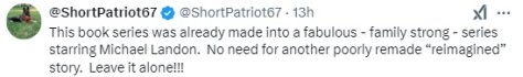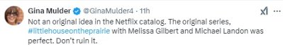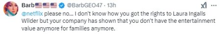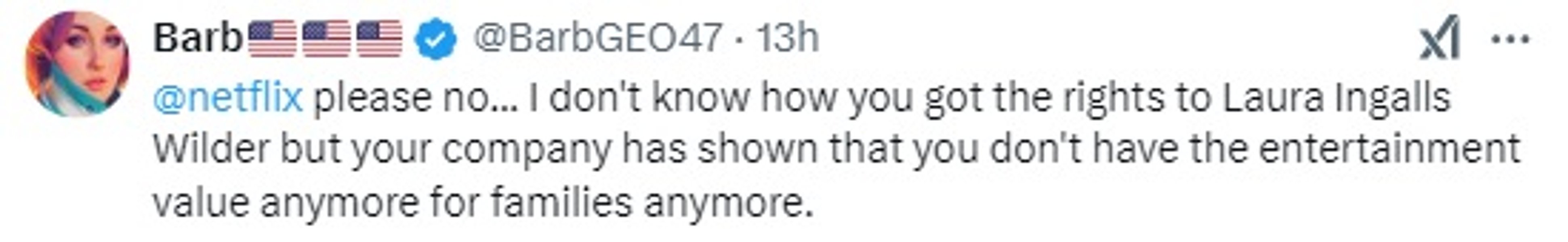 "Ты собираешься сделать Лору Инглз чернокожей и трансгендерной, не так ли…", "Пожалуйста, оставайтесь верны книге. Не добавляйте кучу персонажей и историй, которые не были предназначены для продвижения политической повестки дня", "Не оригинальная идея в каталоге Netflix. Оригинальный сериал #littlehouseontheprairie с Мелиссой Гилберт и Майклом Лэндоном был идеален. Не портите его", "Альберт будет глухим трансгендерным сиротой смешанной расы, который крадет одежду у карлика Лоры и помогает исцелить слепоту Бородатой Мэри с помощью показа мод в Двойной церкви, где она является жрицей-ведьмой", "Не могу дождаться, чтобы увидеть, как вы это переосмыслите", "Каждый раз, когда любимая классика переделывается и продюсерская компания использует слово "переосмысление", вы понимаете, что они ее полностью испортили", "@netflix, пожалуйста, нет… Я не знаю, как вы получили права на Лору Инглз Уайлдер, но ваша компания показала, что вы больше не представляете развлекательной ценности для семей", "Эта серия книг уже превратилась в потрясающий семейный сериал с Майклом Лэндоном в главной роли. Не нужно еще одной плохо переделанной "переосмысленной" истории. Оставьте ее в покое!", – пишут в комментариях. Большая часть подписчиков Netflix также заявила, что не будет смотреть, если сериал не будет "верен оригинальным книгам/телешоу".