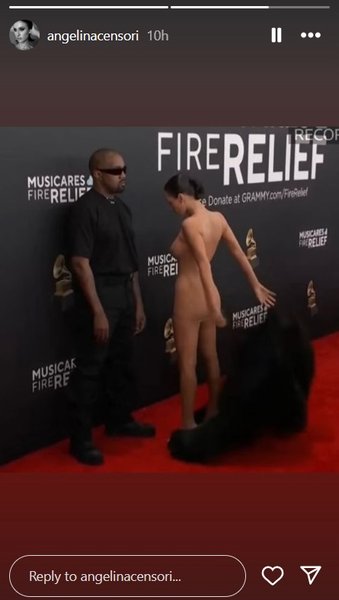 20-летняя Анджелина Цензори, младшая сестра Бьянки Цензори, жены скандального рэпера Канье Уэста, отреагировала на шокирующее обнажение своей родственницы на красной дорожке церемонии вручения премии "Грэмми 2025" в Лос-Анджелесе. В сторис Instagram модель, которая живет со своими родителями Александрой и Лео в Мельбурне (Австралия), поделилась видео момента, когда Бьянка сбрасывает шубу, под которой ничего нет, кроме абсолютно прозрачного платья.