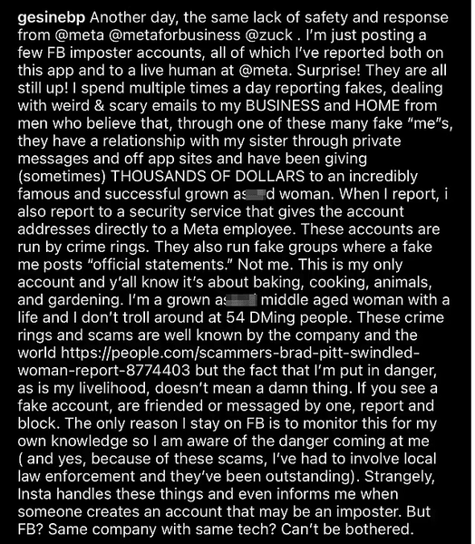 "Я провожу много времени в день, сообщая о фейках, имея дело со странными и страшными электронными письмами на мой рабочий и домашний адреса от мужчин, которые считают, что через одного из этих многочисленных фейковых "я" они вступают в отношения с моей сестрой через личные сообщения и сайты приложений и отдают (иногда) тысячи долларов невероятно известной и успешной взрослой женщине", — написала она в длинной подписи. Женщина добавила, что обо всех подобных фактах она сообщает непосредственно сотруднику Meta.