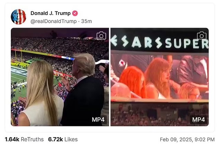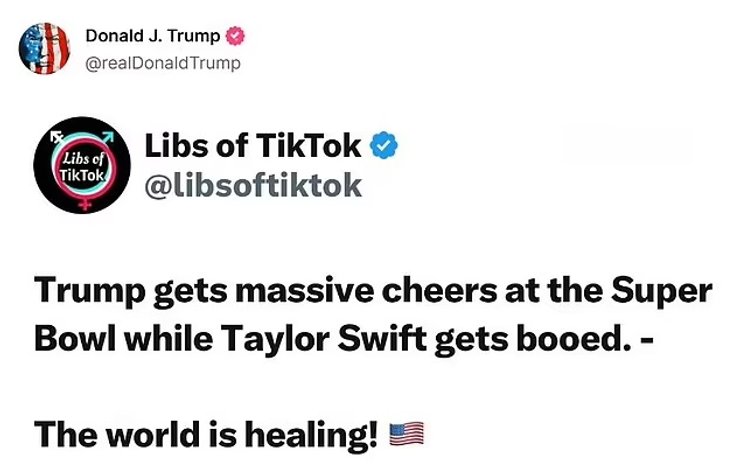 Он также опубликовал пост другого пользователя с подписью: "Трамп получает огромные аплодисменты на Суперкубке, в то время как Тейлор Свифт освистывают".