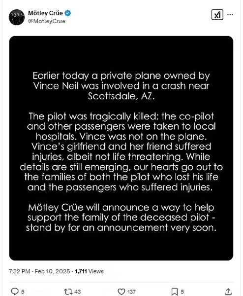 "Сегодня утром частный самолет Винса Нила потерпел крушение недалеко от Скоттсдейла, штат Аризона. Пилот трагически погиб. Второй пилот и другие пассажиры были доставлены в местные больницы. Винса не было в самолете. Девушка Винса и ее подруга получили травмы, хотя и не опасные для жизни. Хотя подробности еще не известны, мы всем сердцем сочувствуем семьям погибшего пилота и пострадавших пассажиров. Mötley Crüe объявит о способе оказания помощи семье погибшего пилота — ждите объявления совсем скоро", – заявила группа на своей странице в соцсети накануне.