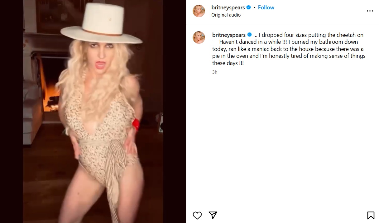 43-летняя американская певица Бритни Спирс продолжает радовать своих 41,8 млн подписчиков новыми видео со своими "дикими" танцами. Теперь артистка сменила просторный светлый холл дома на локацию у горящего камина. В новом видео Бритни не просто танцует в купальнике с хищным принтом и сапогах, но и похвасталась своими достижениями.