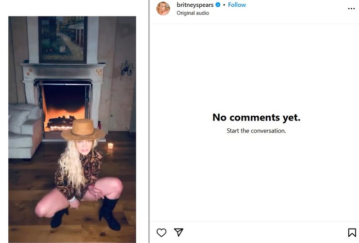 Это – второе видео Спирс за последние сутки. Ранее она делилась кадрами, где пляшет на фоне того же камина в узорном боди, черных сапогах и коричневой шляпе под песню Джастина Тимберлейка. С ним певица встречалась в конце 90-ых-начале нулевых и даже сделала от него аборт.