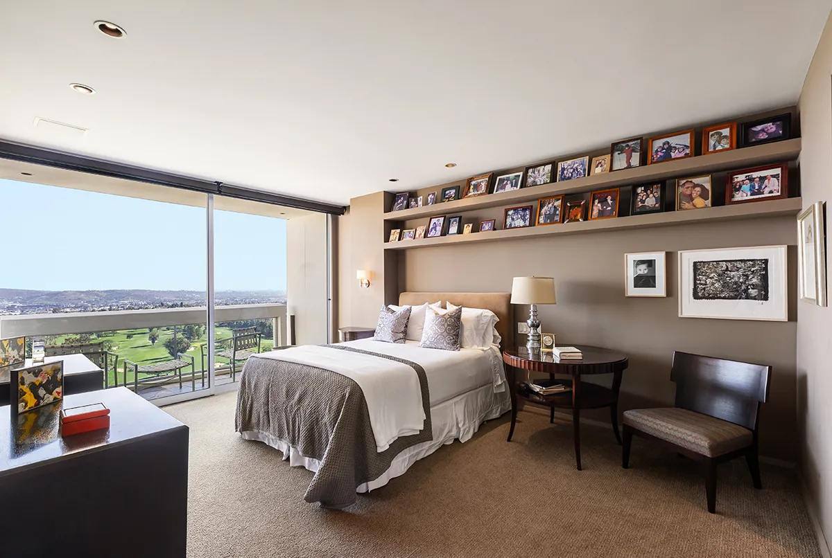 В главной спальне очень примечателен встроенный стеллаж над кроватью, где размещены ряды фото в рамках. В комнате также есть одно большое окно от пола до потолка, которое также ведет в собственную зону отдыха на открытом воздухе.
