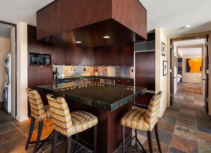 Всего в нескольких шагах от гостиной расположена кухня с плиточным полом, темными деревянными шкафами и темными столешницами, а также барной стойкой. Кроме того, на кухне также есть множество приборов из нержавеющей стали, включая духовку, посудомоечную машину, микроволновую печь и раковину.