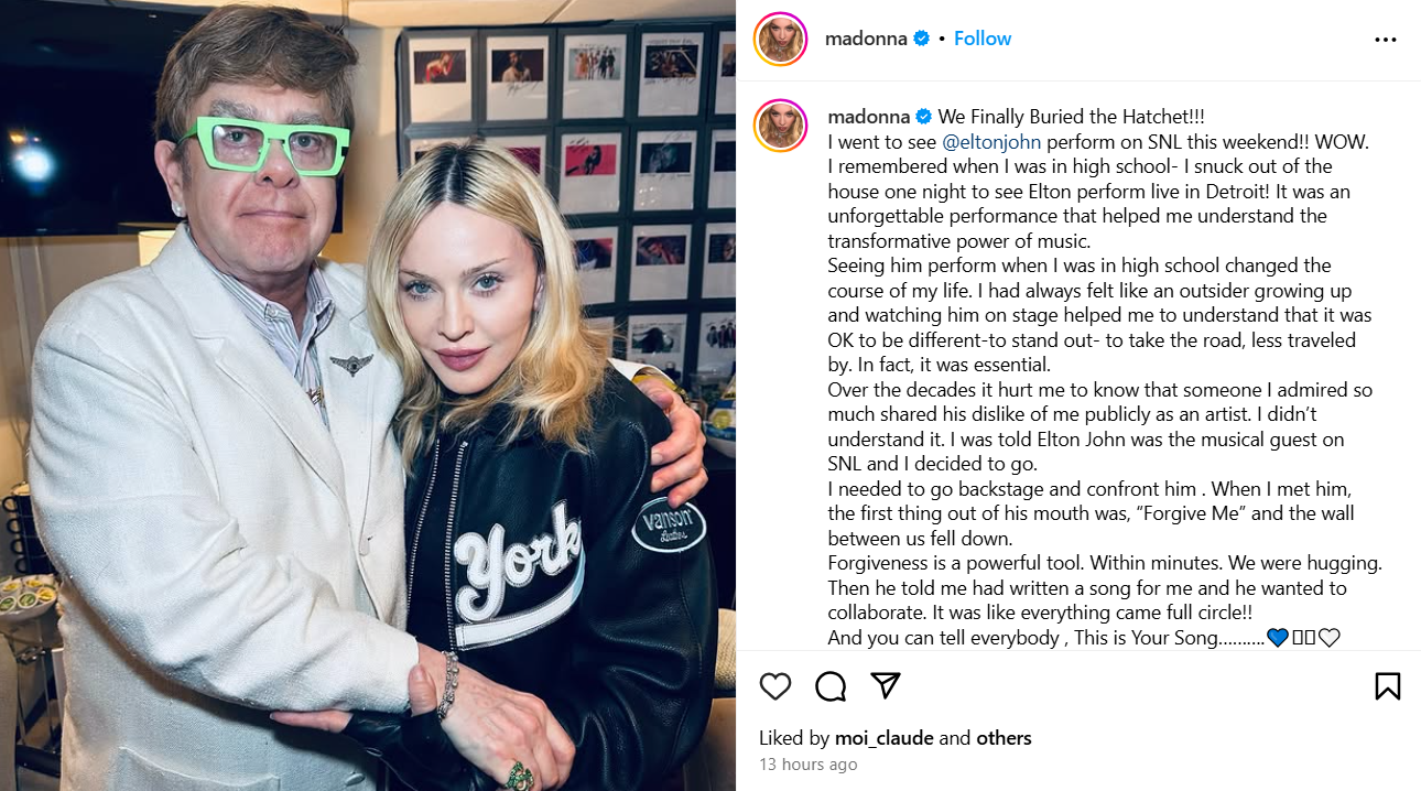 "Мы наконец-то зарыли топор войны!!!. На протяжении десятилетий мне было больно осознавать, что кто-то, кем я так восхищалась, публично выражал свою неприязнь ко мне как к артистке. Я этого не понимала", – объявила королева поп-музыки в посте в Instagram, добавив фото с Джоном за кулисами "SNL" под мелодию его классической "Your Song".