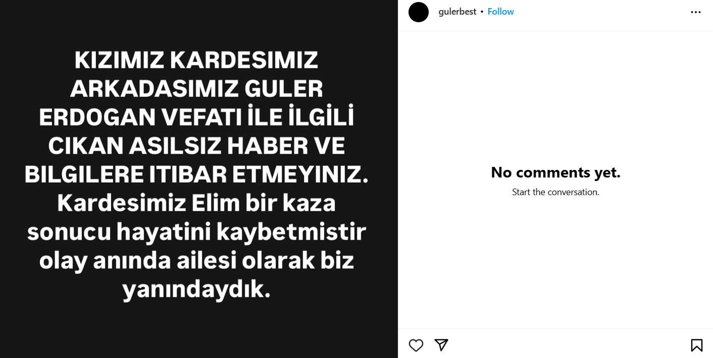 "Не верьте ложным новостям и информации о смерти нашей дочери, сестры и друга Гюлер Эрдоган. Наша сестра потеряла жизнь в результате трагического несчастного случая. Как ее семья, мы были рядом с ней во время инцидента", – говорится в публикации.