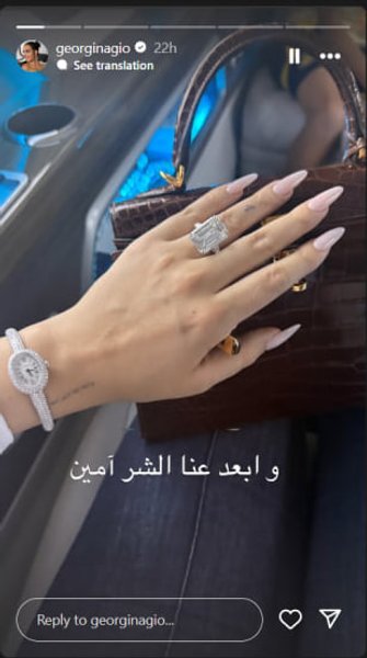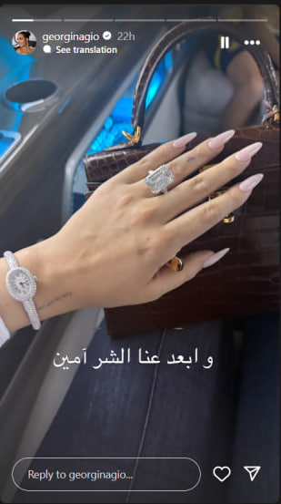 Изображение прямоугольного полупрозрачного камня на пальце и часов, усеянных бриллиантами она подписала словами "И убереги нас от зла, аминь" на арабском языке. В данном случае Джорджина могла иметь в виду усиленную защиту вокруг нее и ее семьи в Саудовской Аравии.