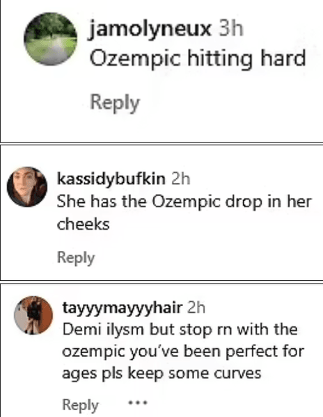 "Королева Ozempic", "Ozempic бьет сильно", "Дорогая, просто прекрати принимать Ozempic", "Деми, но прекрати принимать Ozempic, ты была идеальной в течение многих лет, пожалуйста, сохрани некоторые изгибы", – пишут под фото.