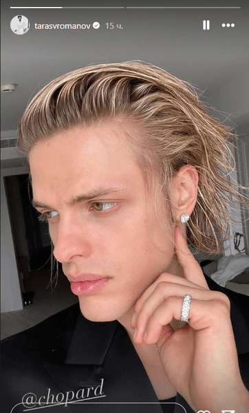 В свою очередь Тарас выбрал черный костюм, надев под него черную футболку. У себя в сторис он опубликовал свое фото, отметив, что на нем кольцо и серьга от Chopard.