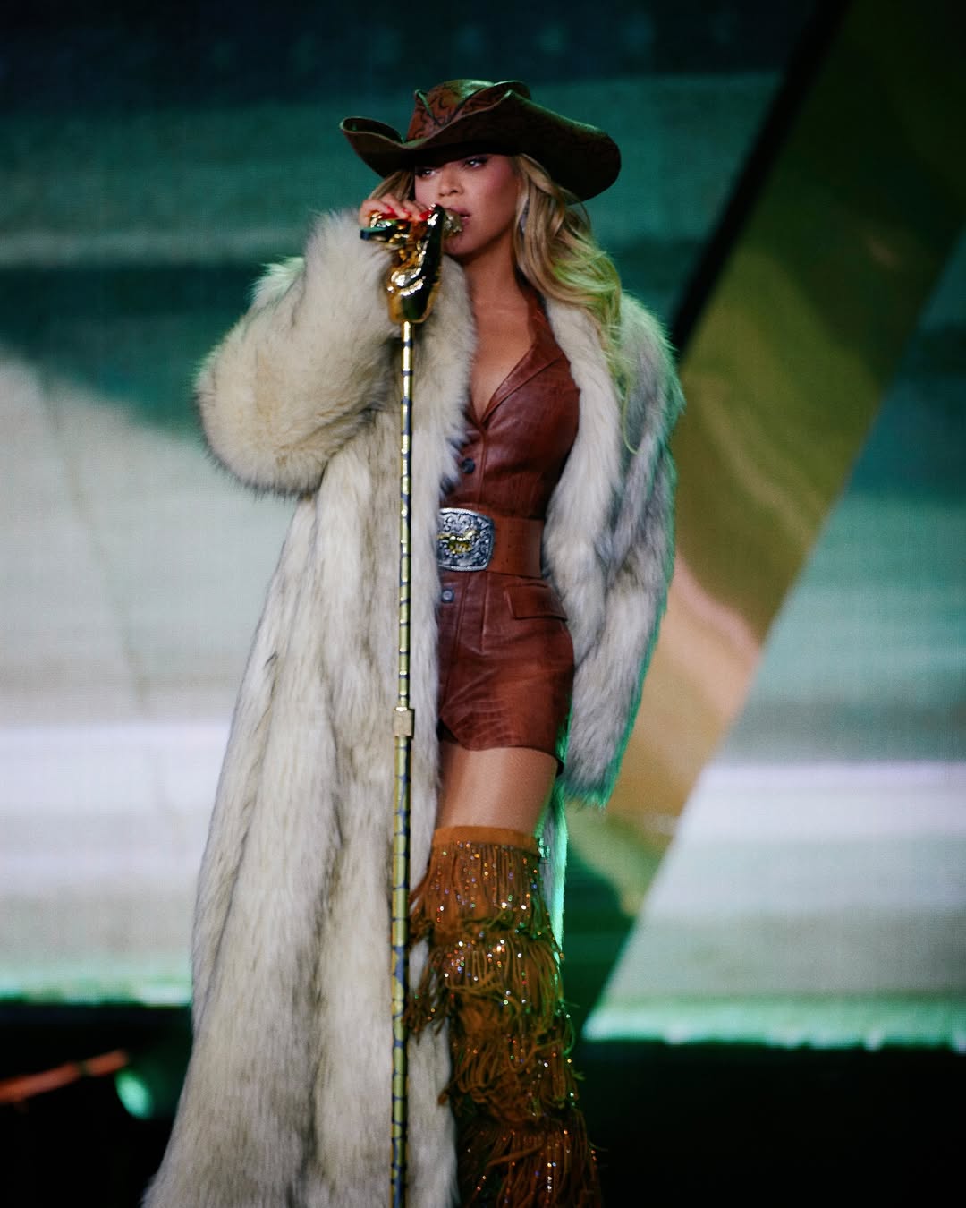 43-летняя знаменитость Бейонсе для события выбрала длинную шубу из искусственного меха. Расслабленный силуэт с вместительными карманами певица соединила с кожаным жакетом, украшенным большой пряжкой, и высокими сапогами с бахромой. Дополнила образ ковбойская шляпа коричневого цвета.