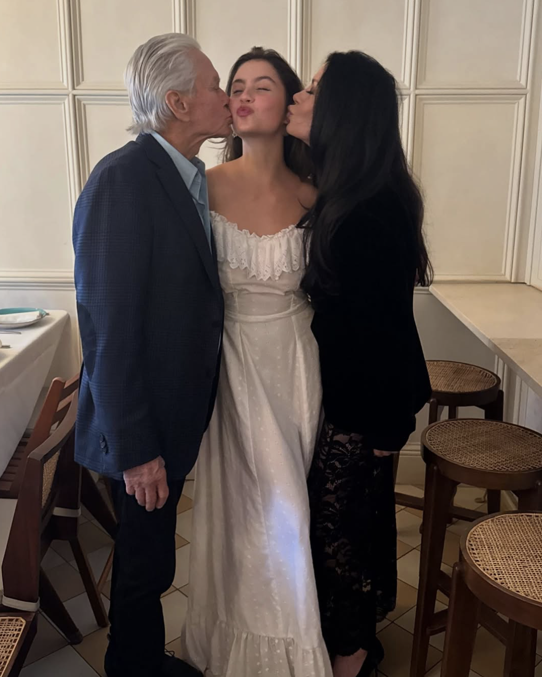 "Ночь перед выпускным! Мы родители, которые так гордятся дочкой! Все только начинается", — подписала фото Кэтрин Зета-Джонс, на котором они с Майклом целуют своего ребенка.